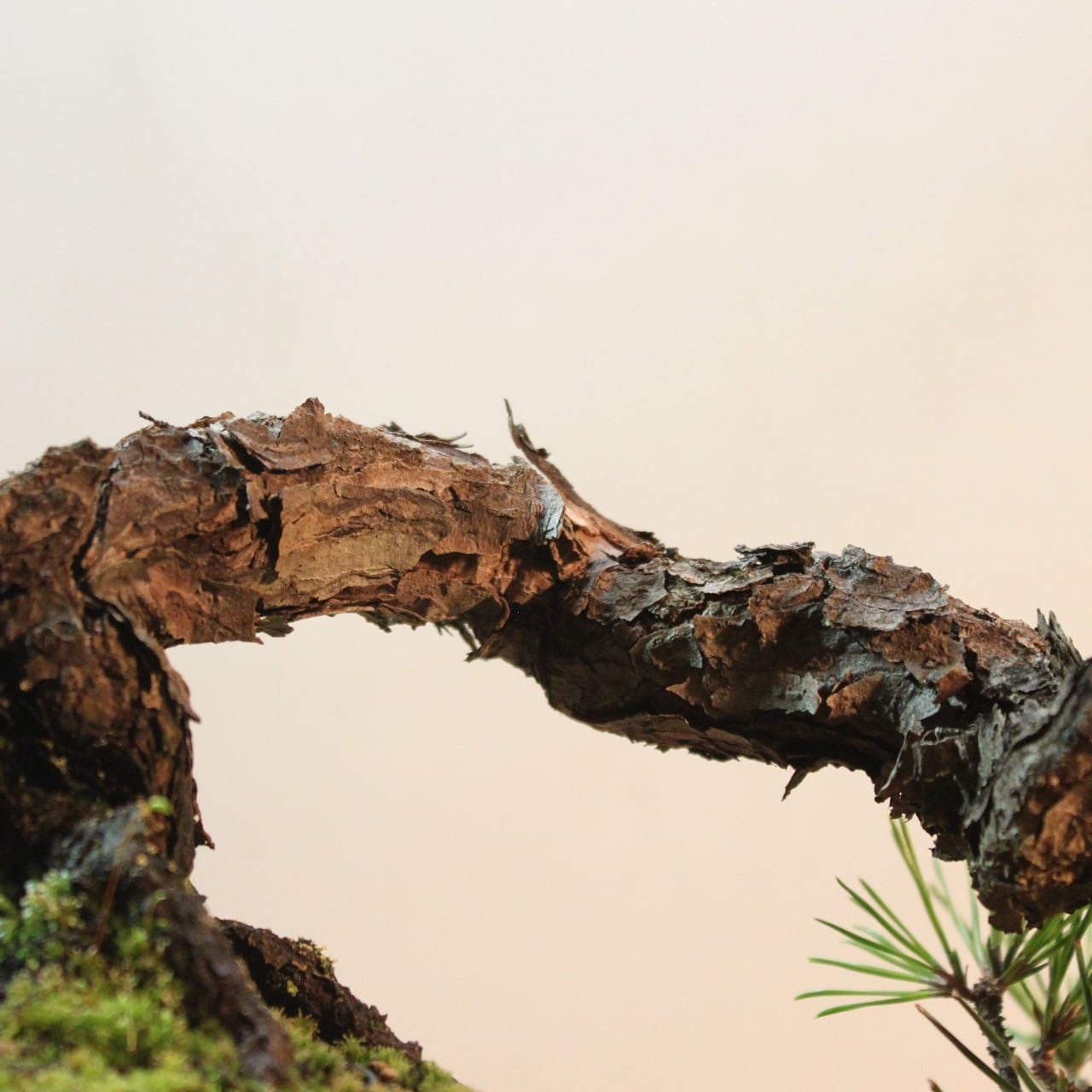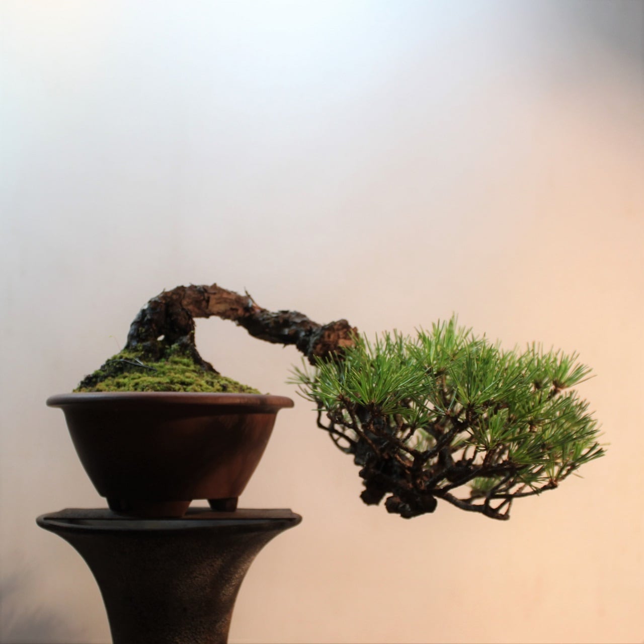 洒落た曲のある細幹の黒松で、細かな枝先の針金掛けを行えば、さらに樹格が上がり成長によっては懸崖樹形までもっていく楽しみもあります。各枝が素直に太るように剪定しているのでスムーズに整姿できると思います。