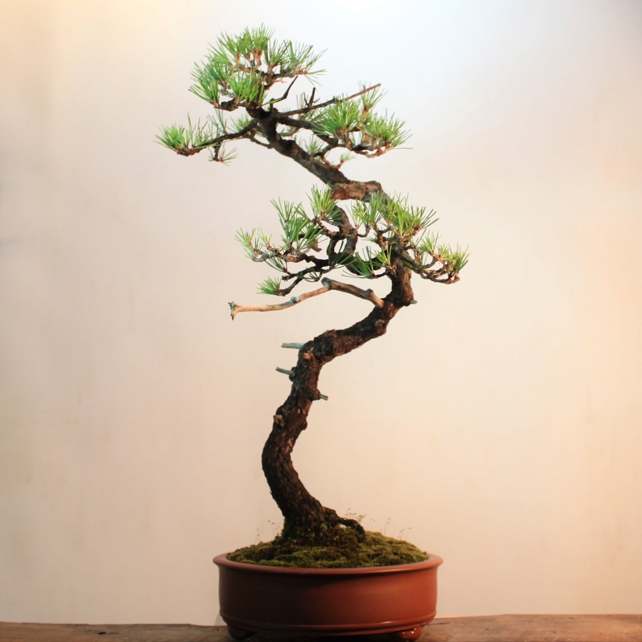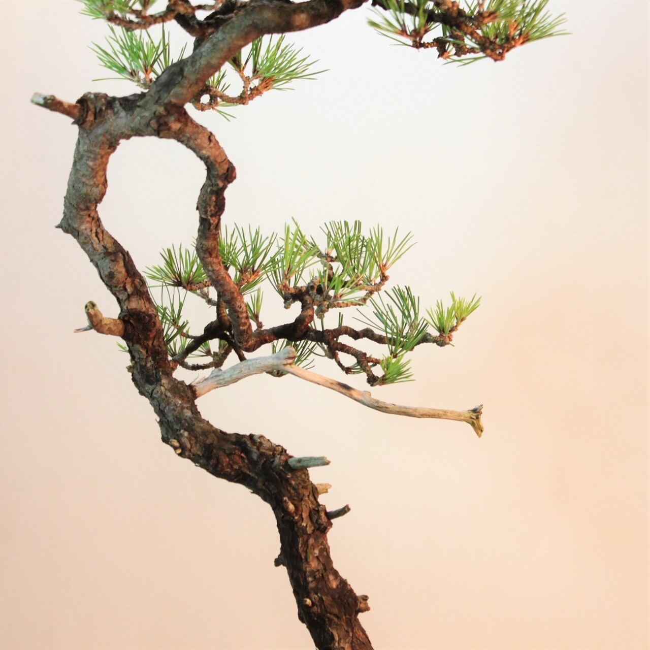 細幹の文人樹形で幹の曲と落ち枝が特徴の黒松で、既に樹形が完成しているので飾り映えする一鉢です。